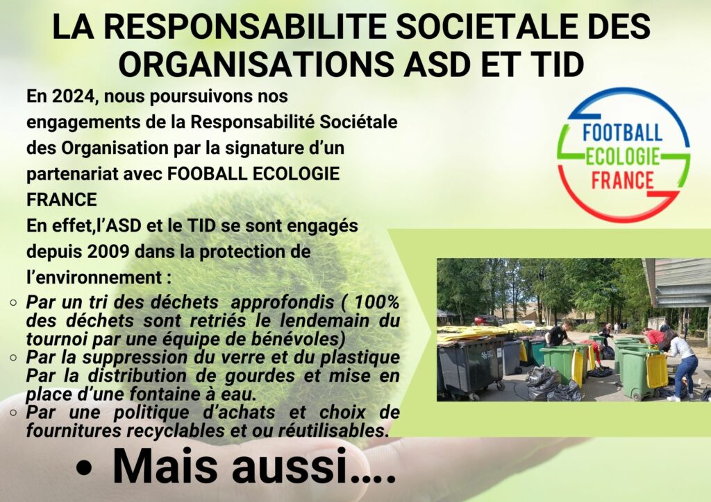 Les principes de la RSO sont déjà ancrés dans la cultures du club. Il est cependant important de revenir sur le rôle de céateur de liens que sont l’ASD et le TID, mais aussi le travail effectué quant à la protection de l’environnement et le traitement des déchets…